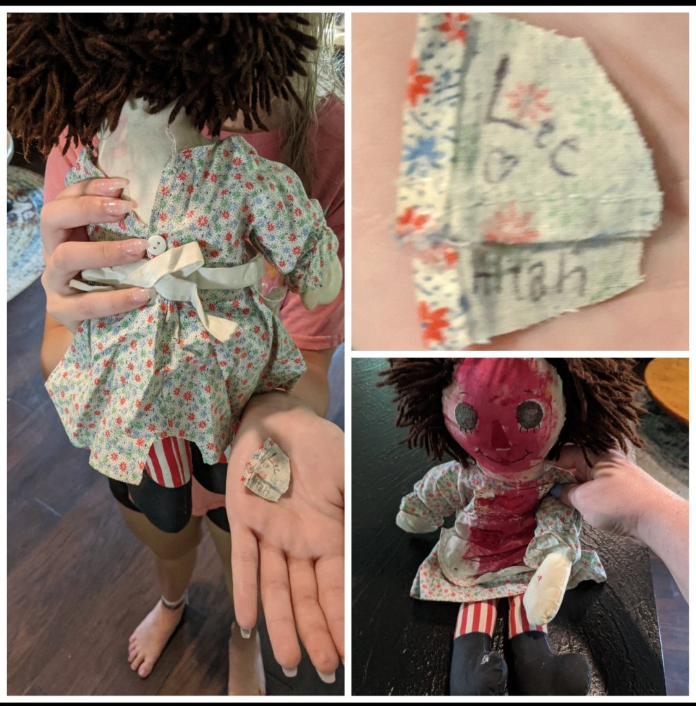 As this day closes.. I can’t help but realize the importance of little things! They are the big things! Before we left to head to Lee’s service today.. Aleah had me go dig out her doll, Sally that Lee had gifted her when she was just a little girl… the doll has been stored in a Rubbermaid for several years. Let’s just say Sally has seen her better days. Aleah decided to cut a piece of fabric from the back of her doll’s dress so we could leave it at Lee’s graveside. Lee’s family was very kind and let me drop the fabric down into the burial site.