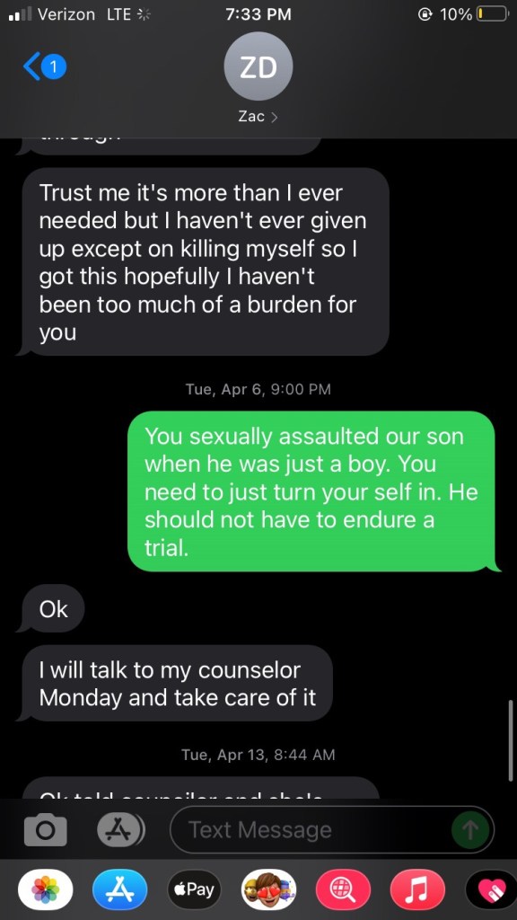 I feel unwell realizing that even when you think your kids are safe and old enough to care for themselves that something like this could be taking place. We are hardworking parents, busy behind the chair earning a living and you know that. You picked up our child for these encounters while we were working and we were not even aware. All I know at this point is that it was probably at least a year timeline. I don’t know any specifics because our son still feels responsible for what happened. That is so fucked up! It is crazy that you can make someone who is so smart, strong and kindhearted feel responsible for your unimaginable messed up ploy and sexual abuse! Please know he is strong, resilient and this traumatic experience has only shaped him to be a better person. I have no doubt that he will continue to be a voice for the underdog and make big things happen in this world. He’s taking the steps to work through the brutal and unpleasant pain you’ve caused.