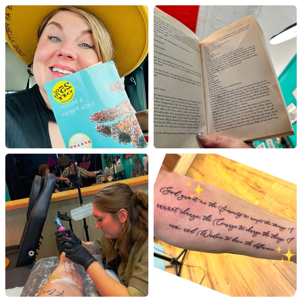 The Serenity prayer has always been a favorite of mine! Today (with the help of my sweet tattoo artist, Madilynn) I made it a piece of art on my body! I also started reading a heartfelt book, A Million Little Pieces. I highly recommend it and I’ve only just started reading it!
