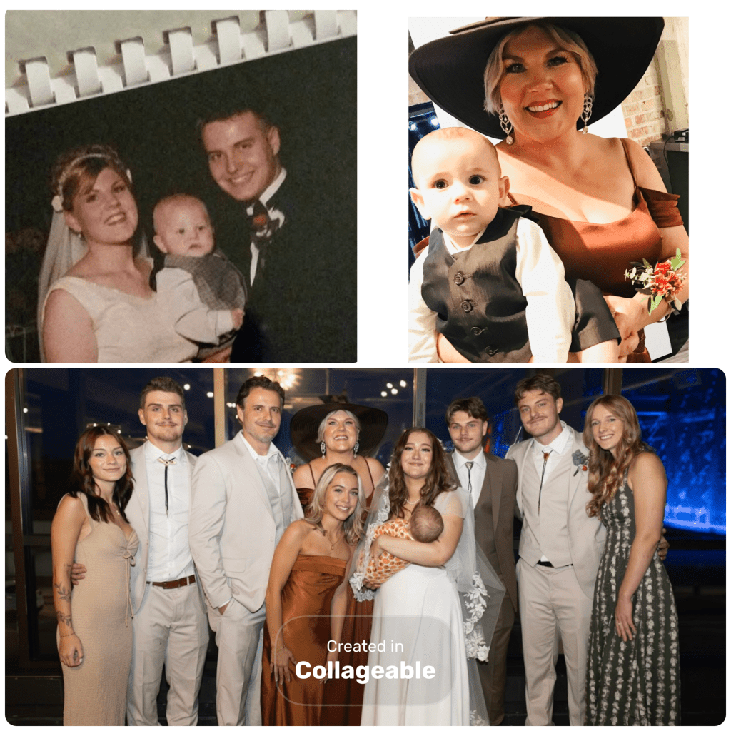 Another photo I’m sharing is me holding our first grandchild at his mom and dad’s wedding — watching our middle son step into his own marriage while we stepped into grandparenthood at the same time.